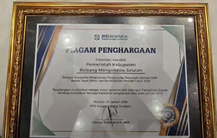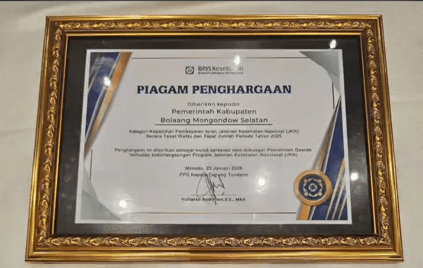Komitmen Pemerintah Kabupaten Bolaang Mongondow Selatan dalam menjaga disiplin administrasi dan tata kelola keuangan kembali menuai apresiasi. Awal tahun 2026 ini, Pemkab Bolsel berhasil meraih dua penghargaan bergengsi dari BPJS Kesehatan Provinsi Sulawesi Utara.