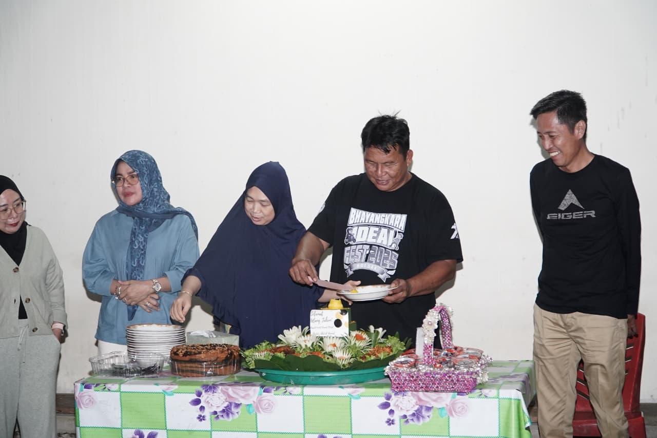 Acara kejutan pun berlangsung sederhana namun penuh makna. Setelah doa bersama yang dipimpin Kepala Bappelitbangda Rikson Paputungan, momen hangat berlanjut dengan pemotongan tumpeng oleh istri tercinta Ny. Rosdiana Abdul Hamid Lapatola. Potongan pertama kemudian diberikan kepada Bupati Iskandar.