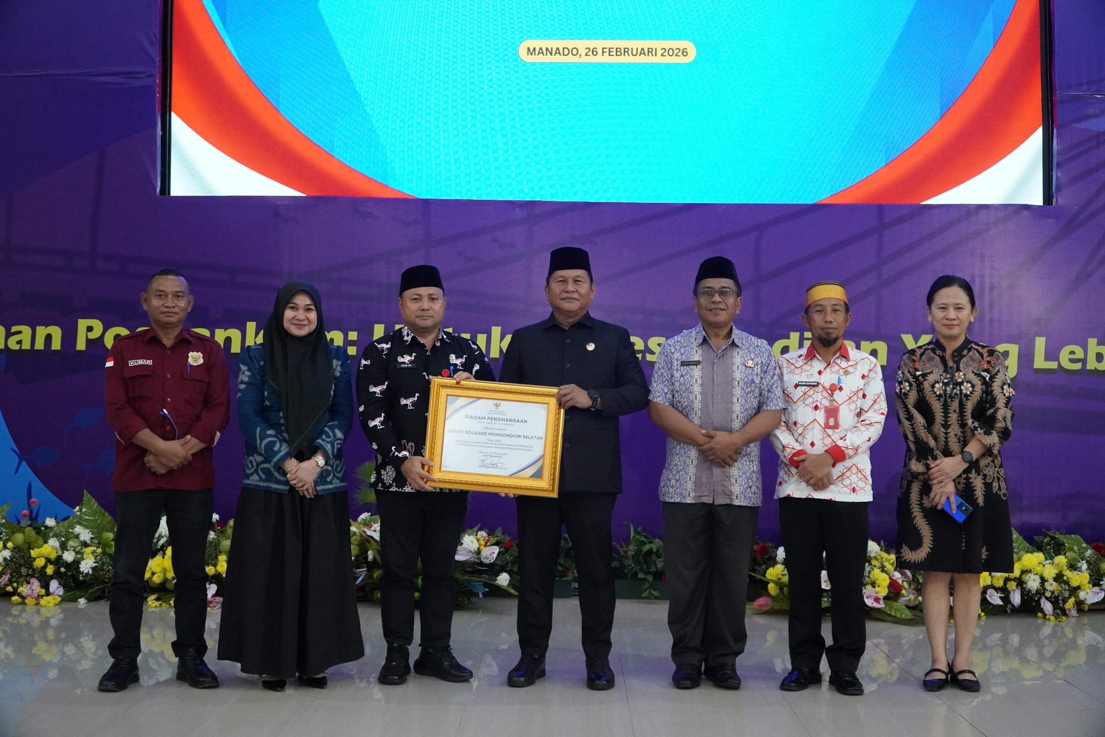 Upaya Pemerintah Daerah Kabupaten Bolaang Mongondow Selatan dalam memperkuat layanan hukum kembali menorehkan catatan positif di awal tahun 2026. Hal tersebut ditandai dengan pemberian piagam penghargaan yang diserahkan langsung Menteri Hukum RI Supratman Andi Agtas kepada Wakil Bupati Deddy Abdul Hamid dalam acara Peresmian Pos Bantuan Hukum dan Pembukaan Pelatihan Paralegal Desa/Kelurahan se-Sulawesi Utara Tahun 2026 yang digelar di Graha Bumi Beringin, Kota Manado, Rabu (25/2/2026).