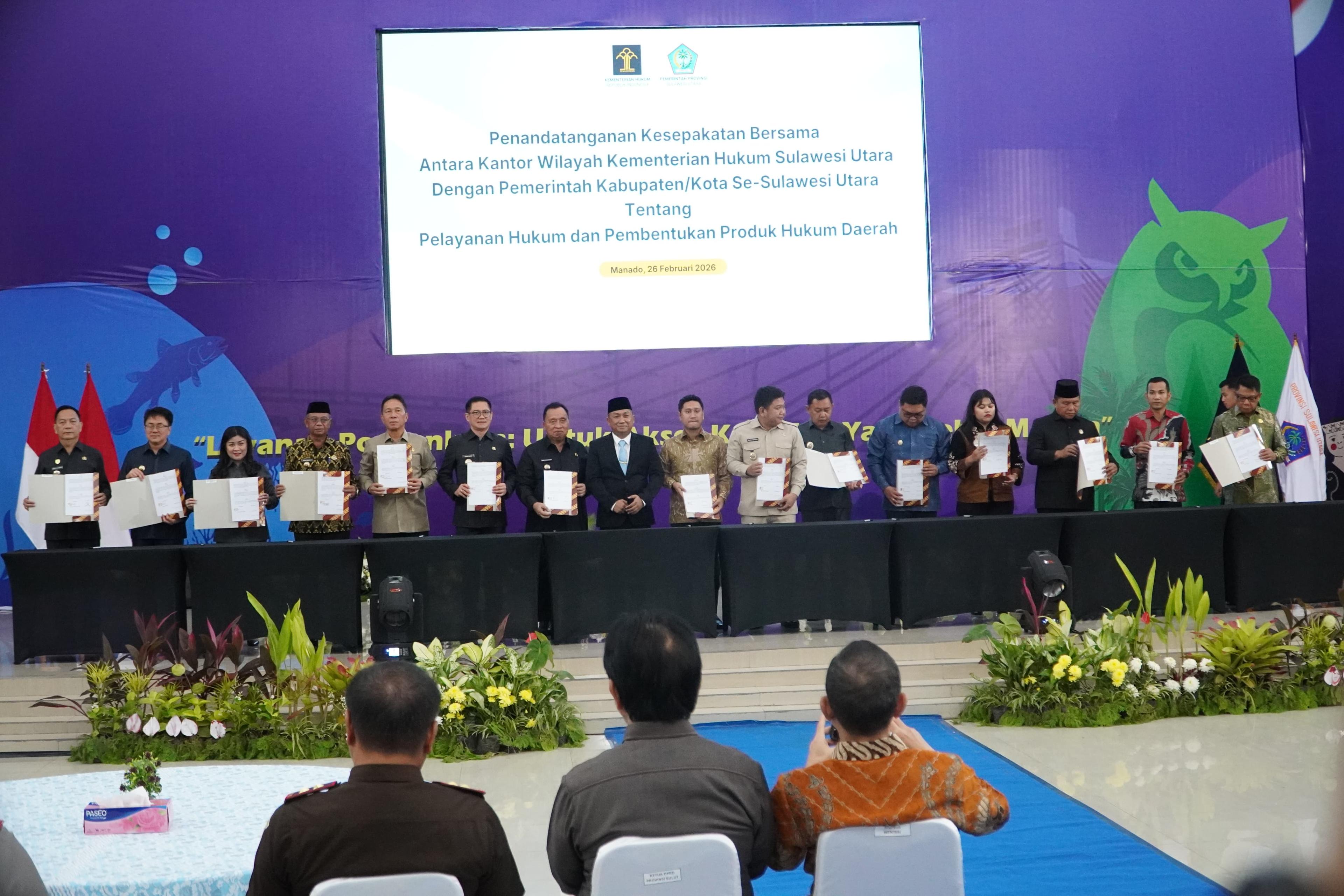 Dalam rangkaian acara, dilakukan pula penandatanganan kesepakatan bersama antara Kanwil Kemenkum Sulut dengan Pemerintah Kabupaten/Kota se-Sulut terkait pelayanan hukum dan pembentukan produk hukum daerah.