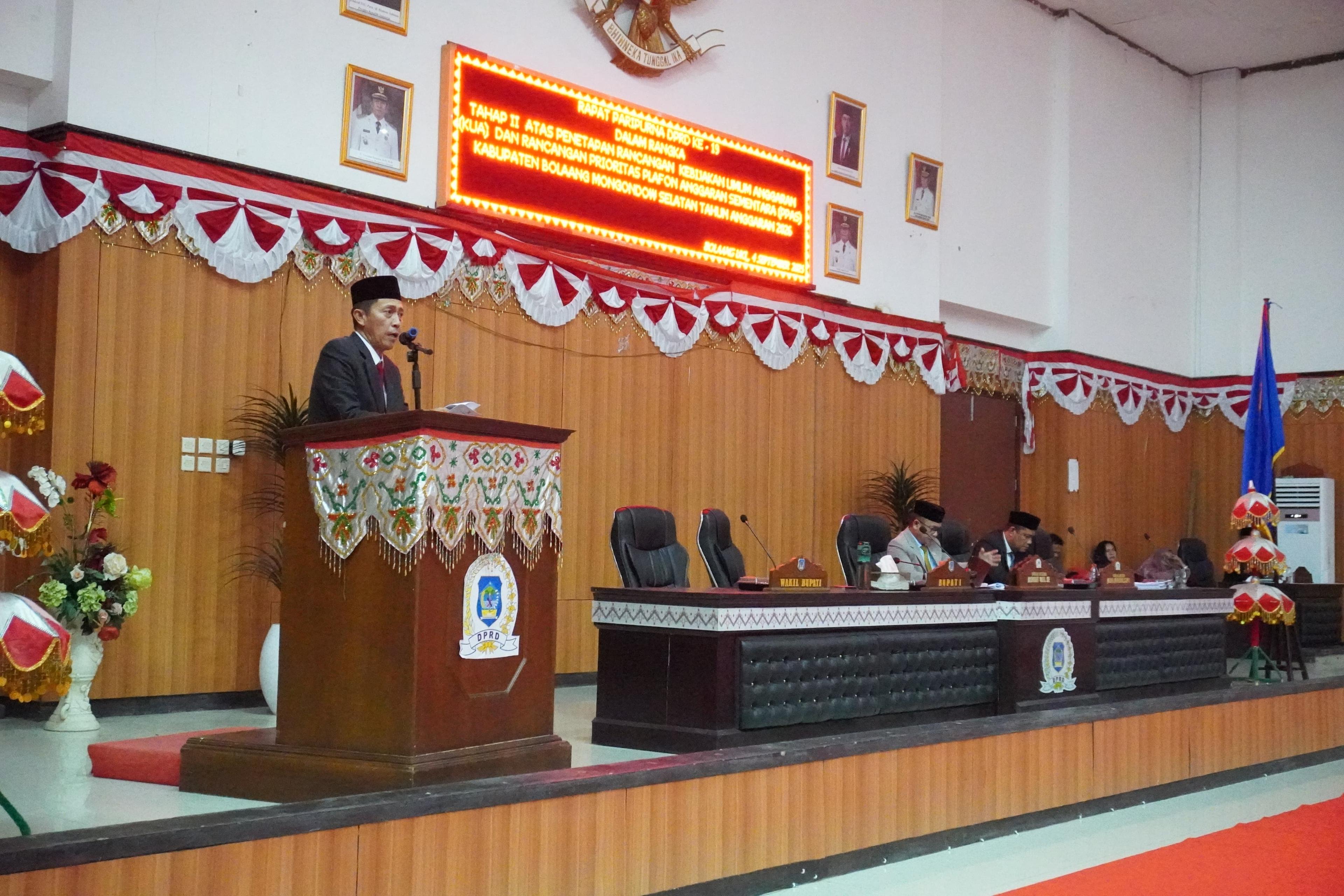 Sinergi antara eksekutif dan legislatif di Kabupaten Bolaang Mongondow Selatan kembali terwujud. Kamis (4/9/2025), DPRD Bolsel bersama Pemerintah Daerah menandatangani nota kesepakatan Kebijakan Umum Anggaran (KUA) dan Prioritas Plafon Anggaran Sementara (PPAS) Tahun Anggaran 2026 dalam rapat paripurna tahap II yang berlangsung di Ruang Sidang Paripurna DPRD, Kawasan Perkantoran Panango, Kec. Bolaang Uki.