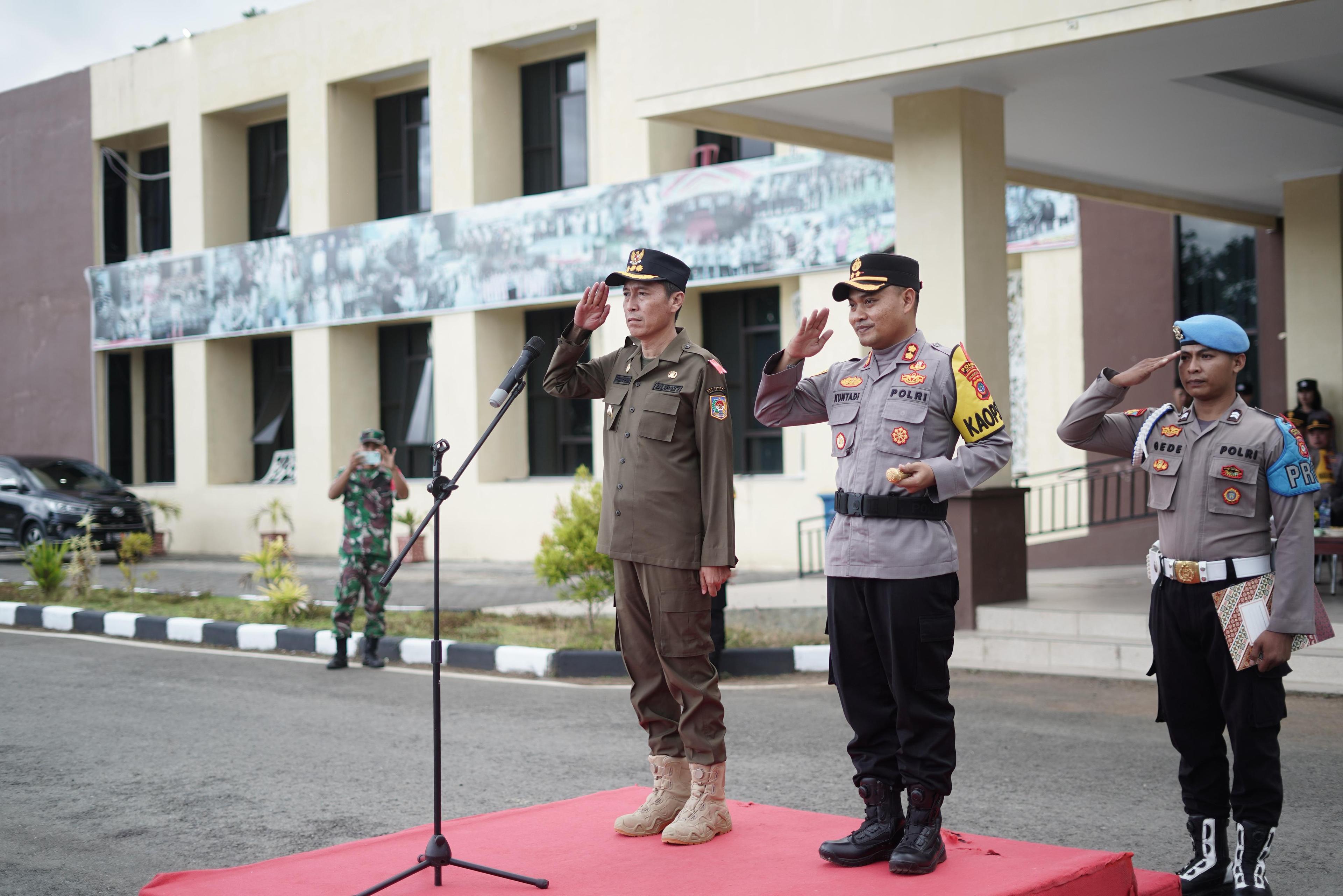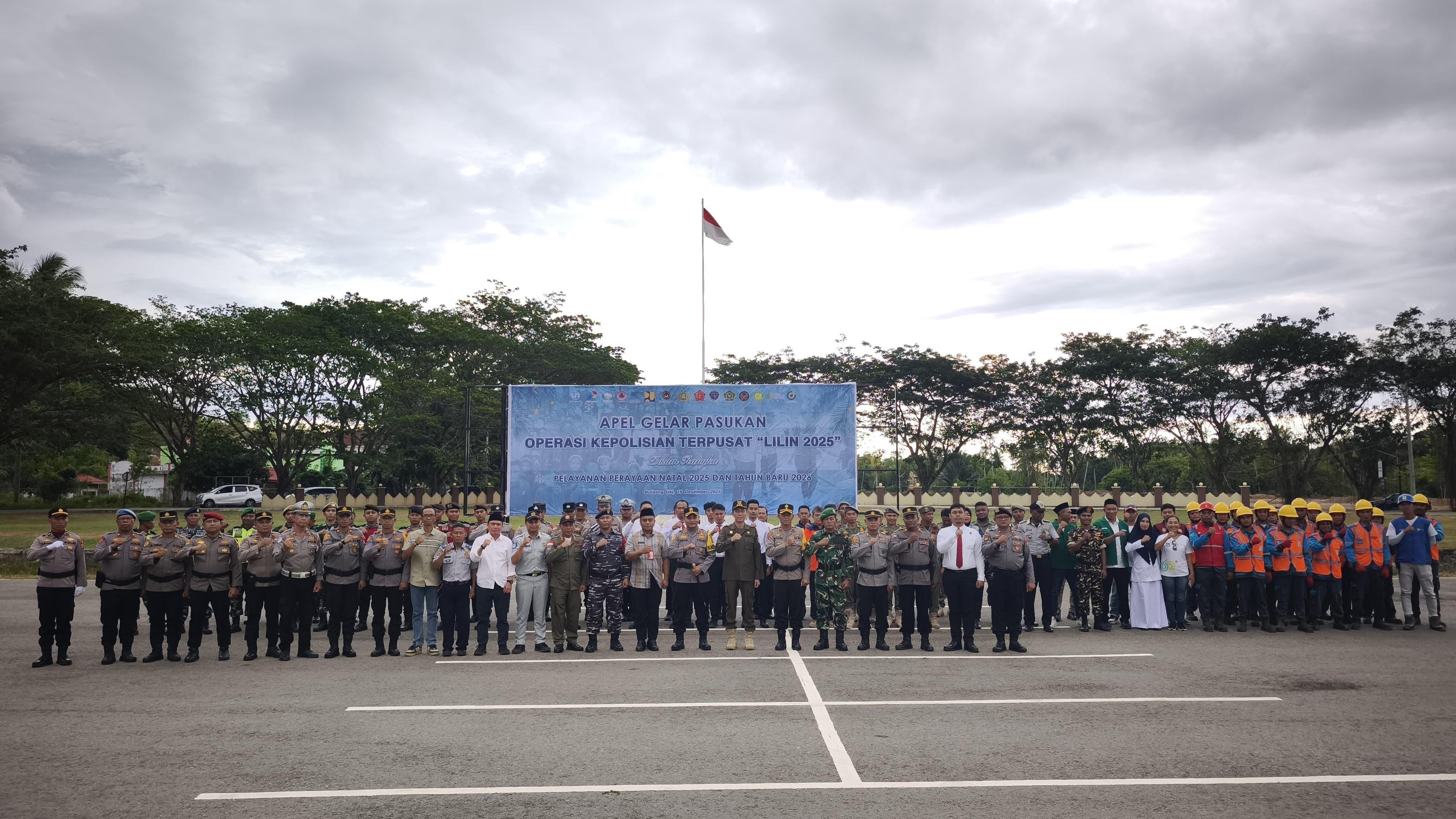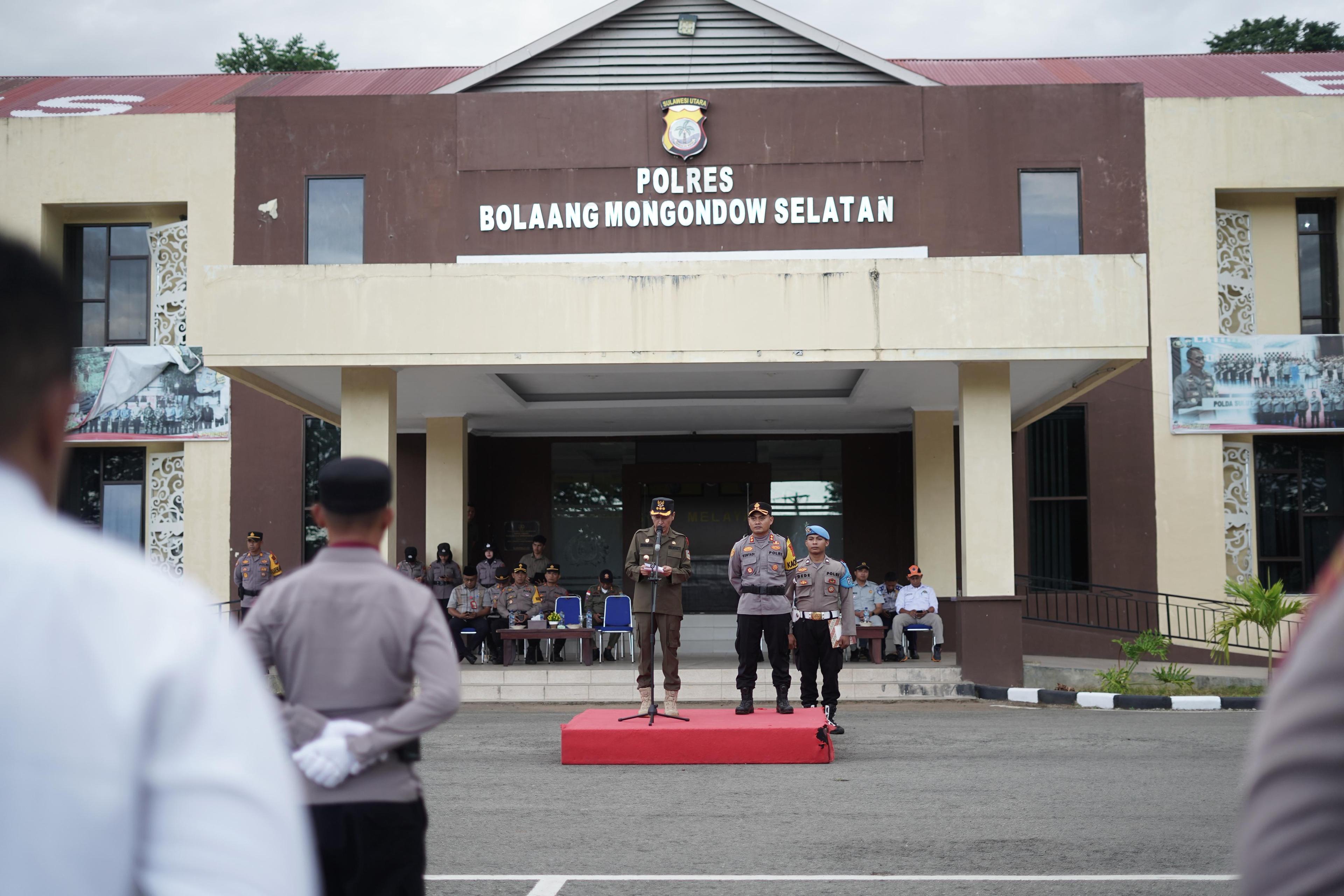 Bupati H. Iskandar Kamaru SPt, MSi menghadiri Apel Gelar Pasukan Operasi Kepolisian Terpusat Lilin Tahun 2025 yang dilaksanakan oleh Polres Bolaang Mongondow Selatan di Lapangan Hitam Polres Bolsel, Desa Tabilaa Kecamatan Bolaang Uki, Jumat (19/12/2025),