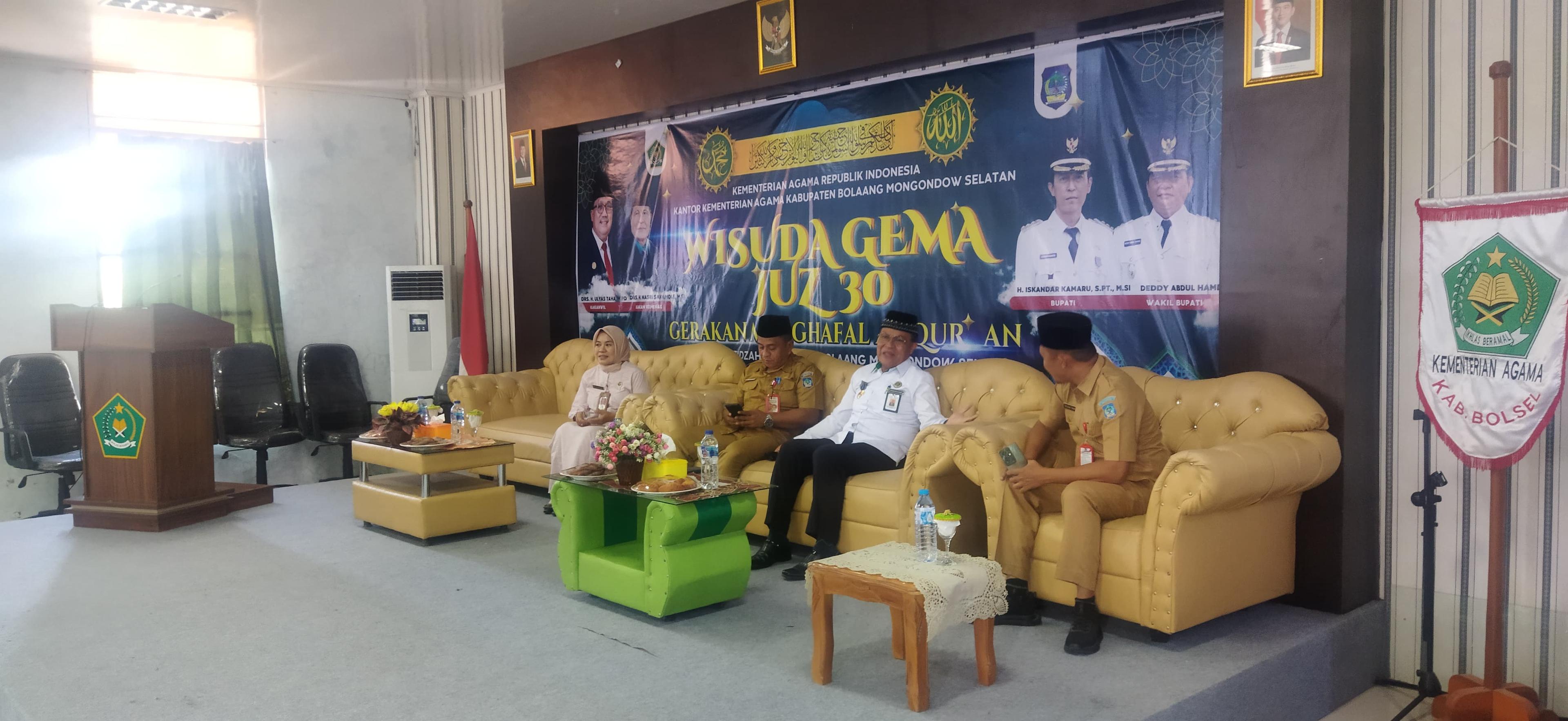 Bupati H. Iskandar Kamaru SPt, MSi diwakili Asisten I Sekda Bid. Pemerintahan dan Kesra Alsyafri U Kadullah SPd, ME menghadiri acara Wisuda Gema juz 30 Angkatan III di Gedung PLHUT Kantor Kementerian Agama Kab. Bolsel, Desa Tabilaa Kec. Bolaang Uki, Senin (16/12/2024).